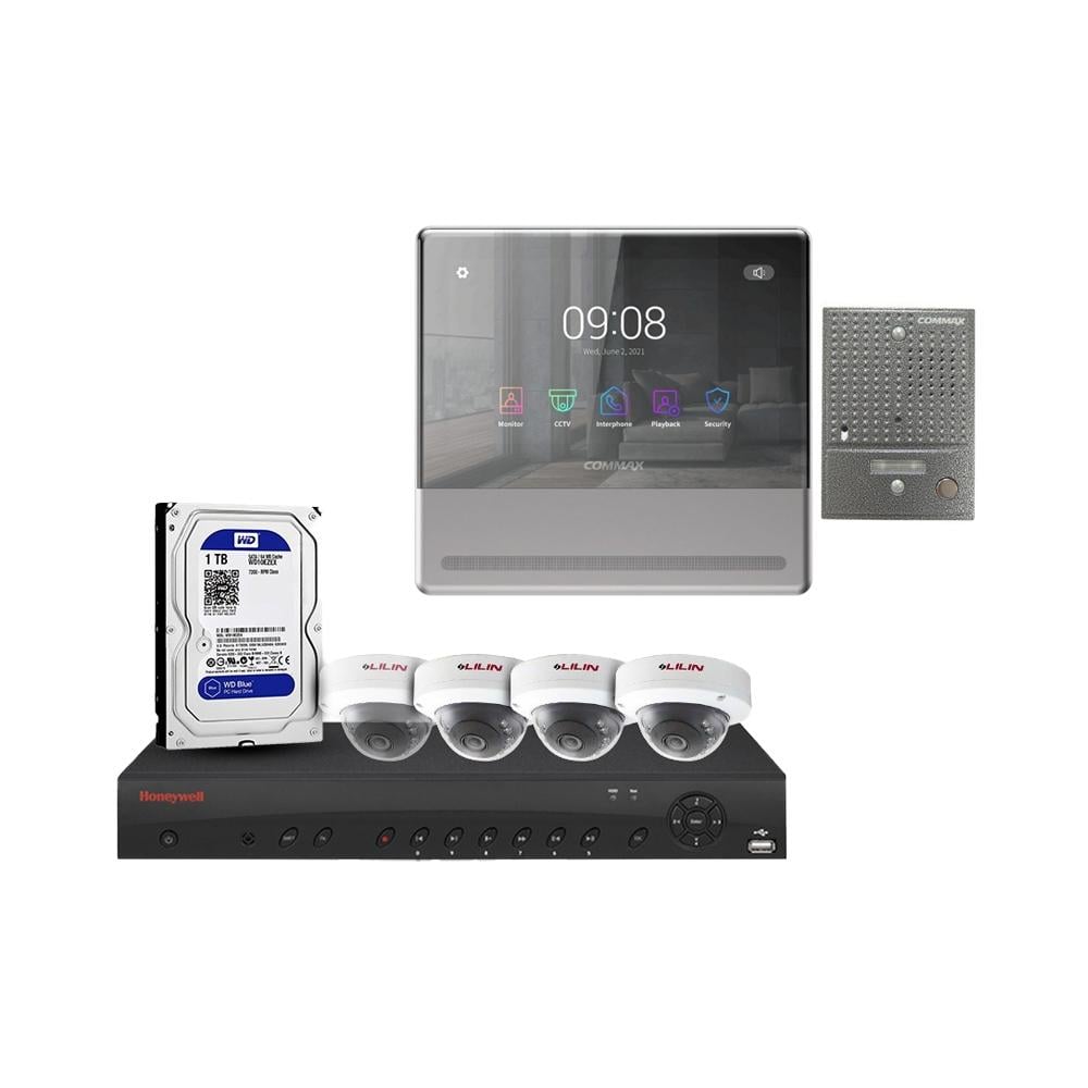 The surveillance system includes 4MP fixed-lens IP cameras, with 4 weatherproof DOME cameras from the Taiwanese brand LILIN. The system also includes a 4-channel NVR recorder from the American brand Honeywell, with a 1TB hard disk, ensuring precise and secure recording of all details.